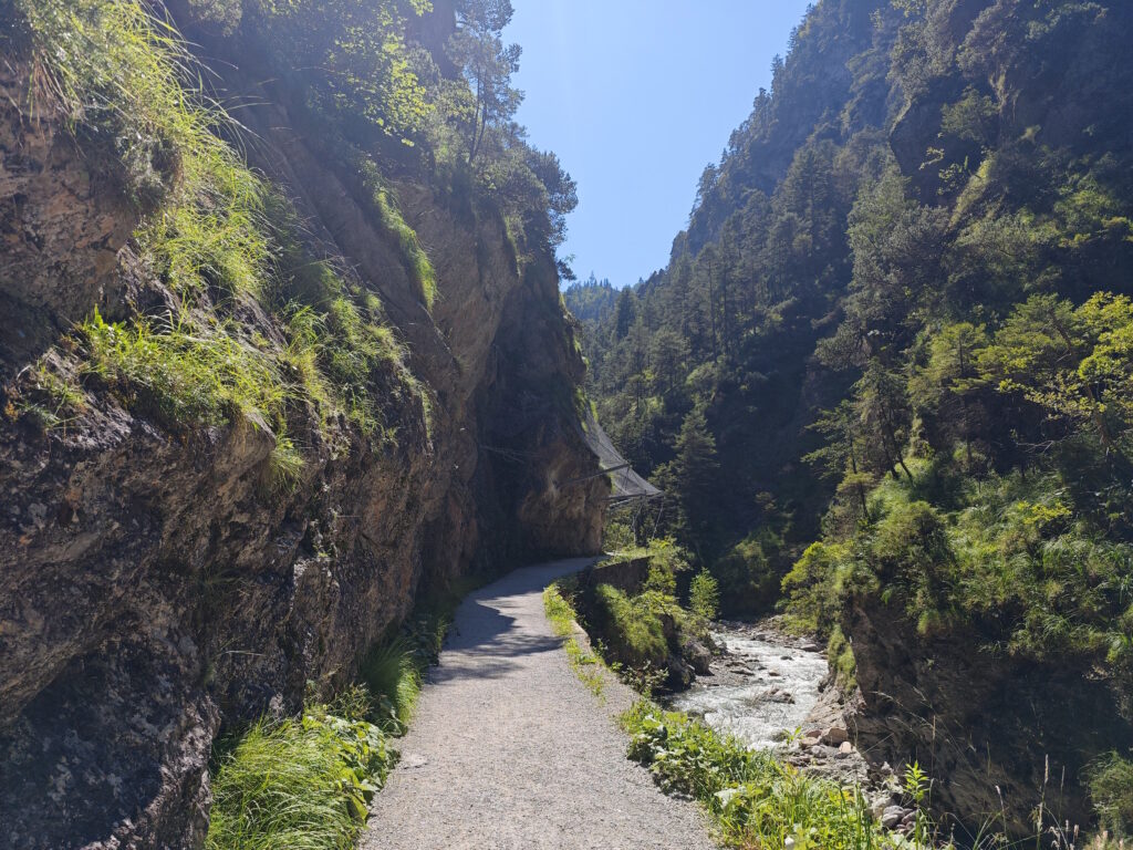 Technisch gesehen ist die gesamte Strecke unkompliziert und der Weg breit ausgebaut. Der Weg besteht größtenteils aus gut befestigtem Schotter, was ihn erstaunlicherweise sogar für robuste Kinderwagen und Rollstühle zugänglich macht. Es gibt praktisch keine steilen Anstiege und keine anspruchsvollen Passagen wie Leitern oder versicherte Steige, die spezielle Trittsicherheit oder Schwindelfreiheit erfordern würden. Die Wanderung verläuft nahezu stufenlos, am tosenden Wasser entlang, zwischen den massiven Felswänden der Schlucht.